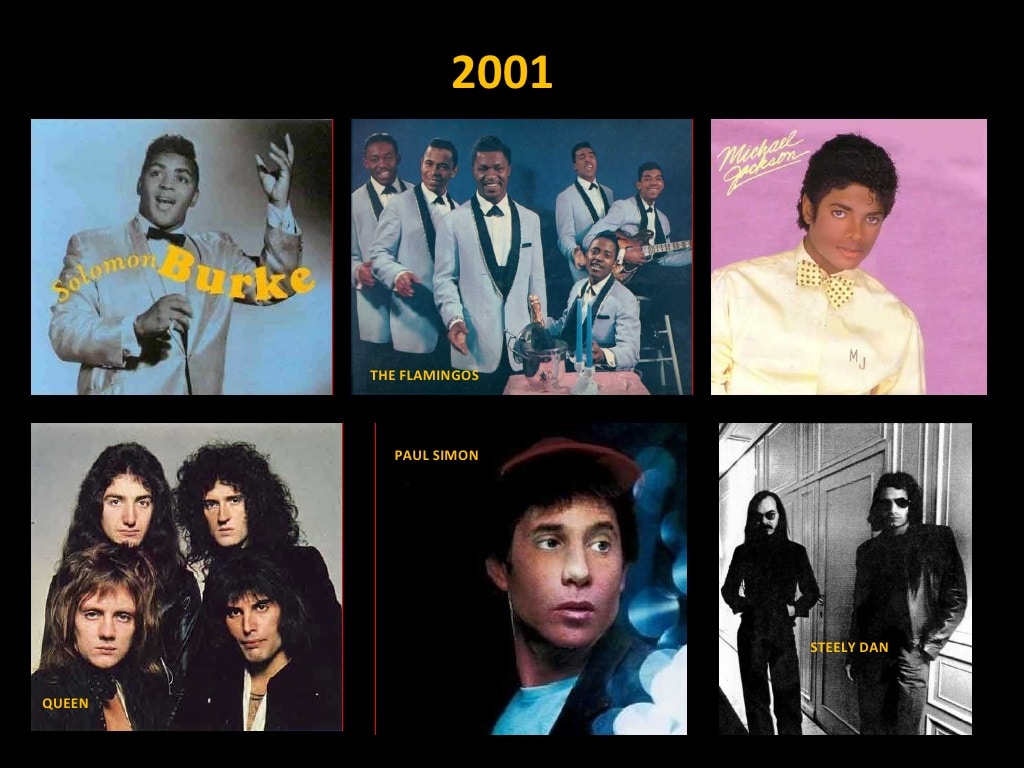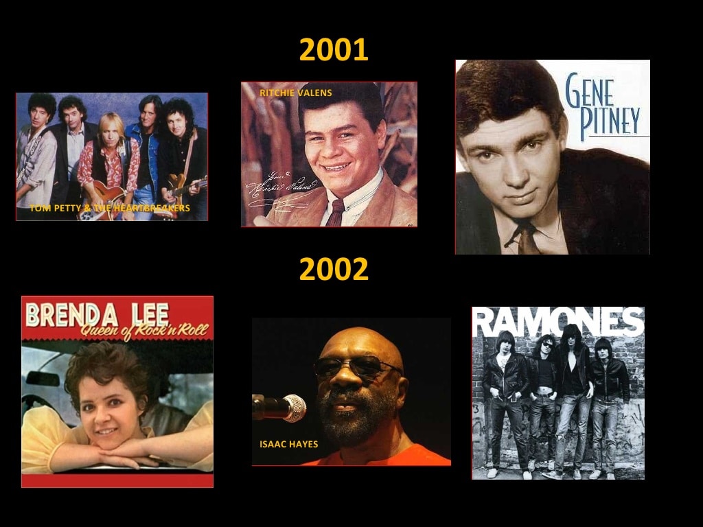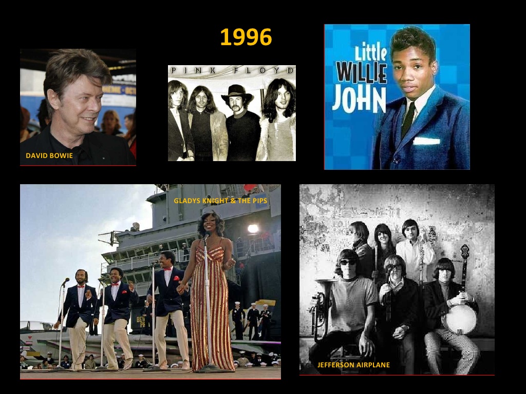 - The Drifters (Ben E. King, Rudy Lewis, Clyde McPhatter, Johnny Moore, Bill Pinkney, Charlie Thomas y Gerhart Thrasher) – R&B, doo wop.